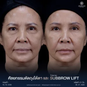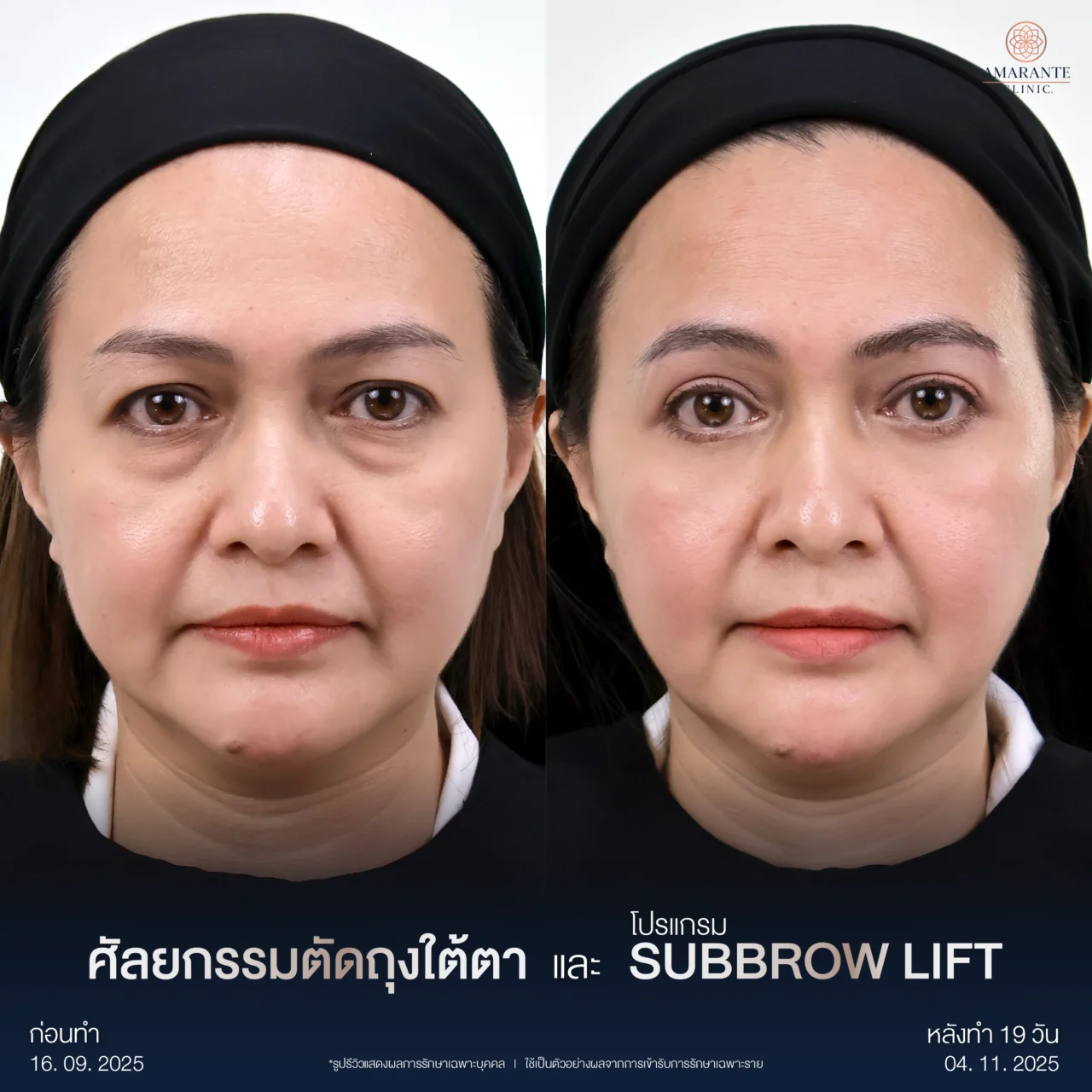ที่ Amarante Clinic การผ่าตัดแก้ไขหนังใต้ตาตก คุณจะได้รับการดูแลโดยคุณหมอทศ ‘นพ.ทศพล สุริย์จามร’ ศัลยแพทย์ตกแต่งเฉพาะทางมากฝีมือที่มีประสบการณ์ยาวนานด้านการแก้ไขโครงสร้างดวงตาที่ซับซ้อนได้อย่างครอบคลุม โดยให้ความสำคัญกับการซ่อมแซมกล้ามเนื้อที่อ่อนแรงโดยใช้เทคนิคเฉพาะ ควบคู่ไปกับเทคนิคการซ่อนรอยแผลที่เป็นเอกลักษณ์เฉพาะตัว ทำให้รอยแผลผ่าตัดมีขนาดเล็ก และถูกซ่อนเอาไว้ ทำให้ผิวบริเวณดวงตาเรียบเนียน และดูเป็นธรรมชาติ ได้ผลลัพธ์ที่สวยงาม อยู่ได้นาน ชั้นตาดูเป็นธรรมชาติ ดวงตาเปิดกว้างขึ้น แผลเล็ก และไม่จำเป็นต้องพักฟื้นนาน