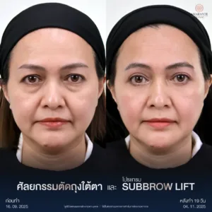- แก้ไขปัญหาด้วยการศัลยกรรมผ่าตัด เพื่อกำจัดผิวหนังและไขมันส่วนเกิน พร้อมเย็บปรับกล้ามเนื้อตา (ในกรณีที่กล้ามเนื้ออ่อนแรง) เพื่อผลลัพธ์ที่ยาวนาน