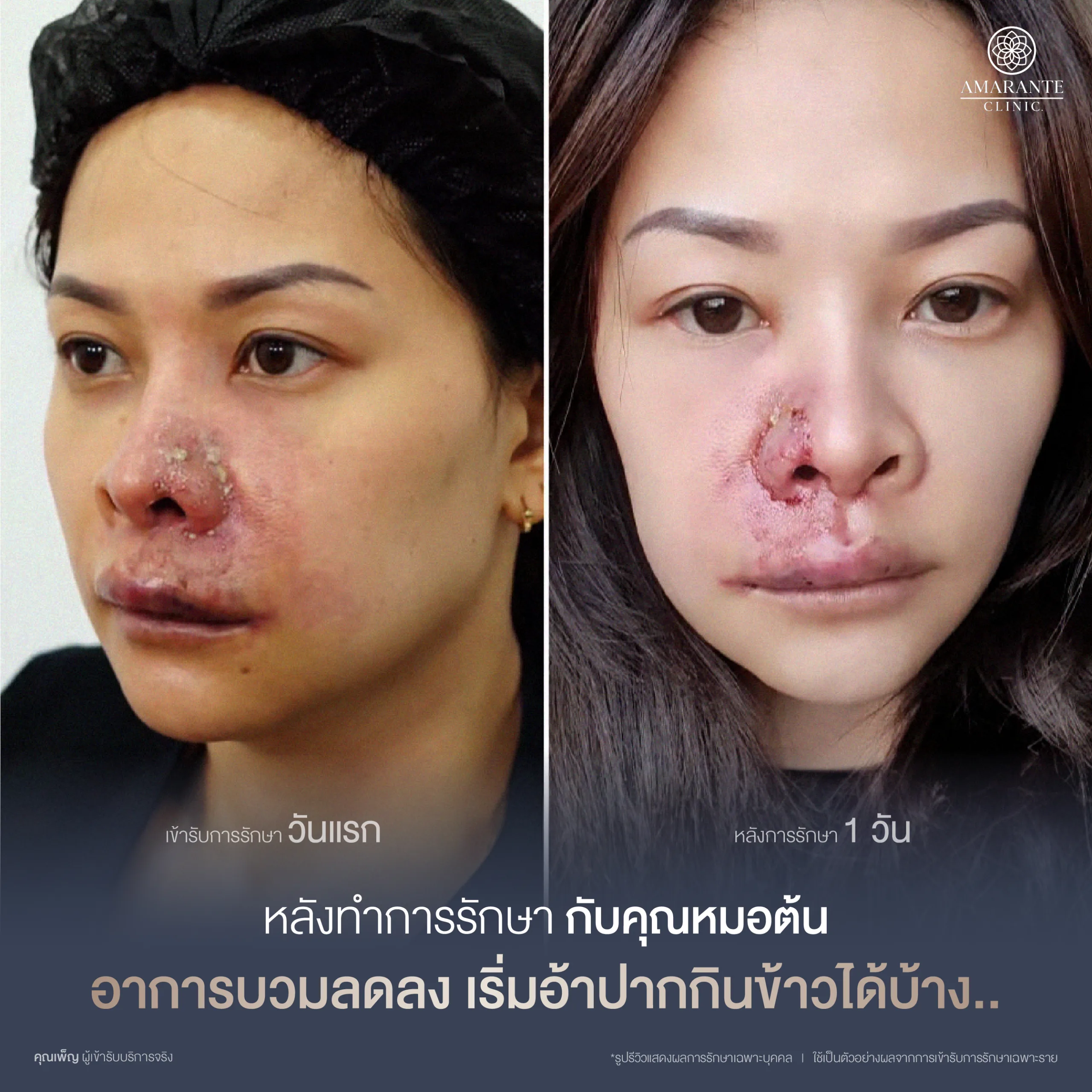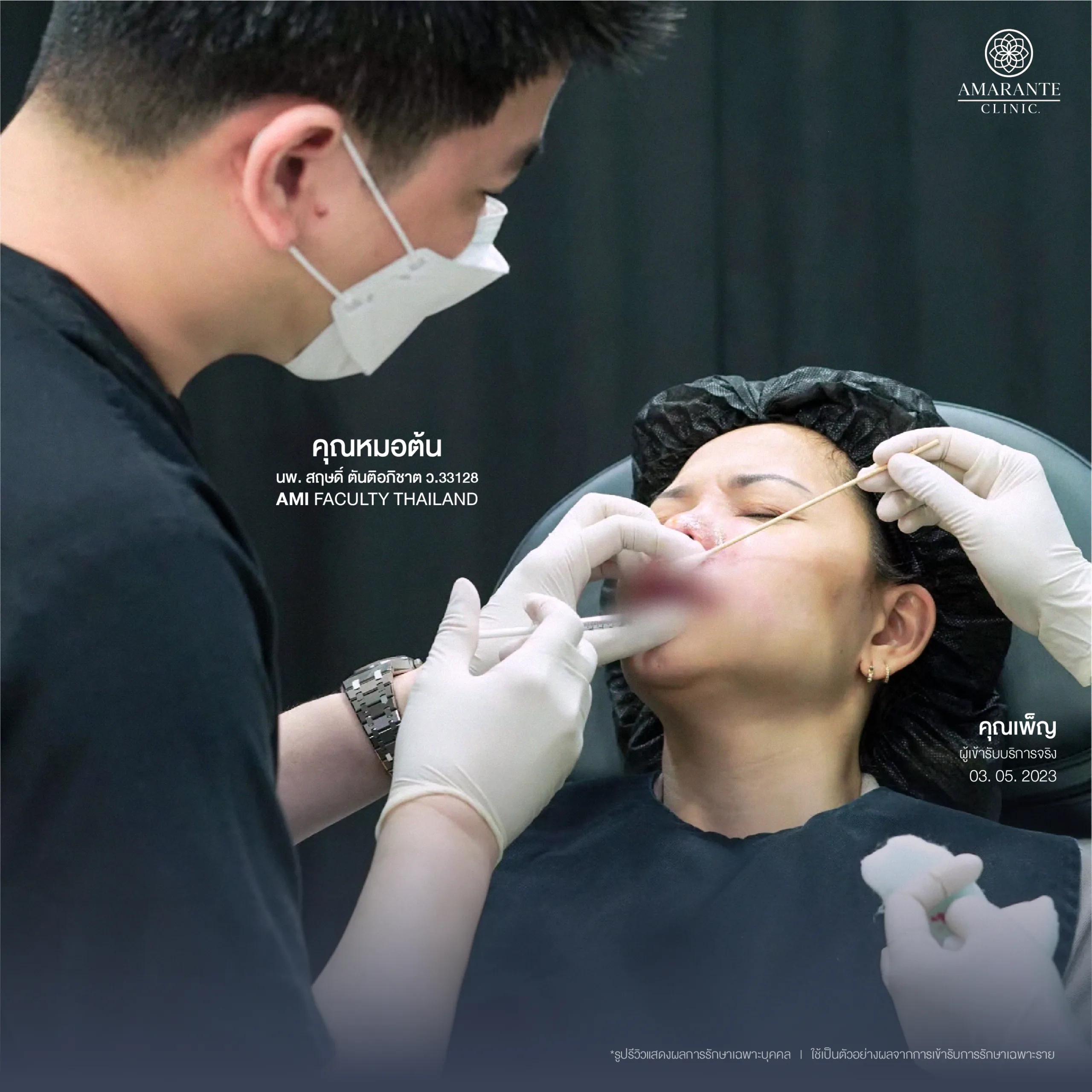 เมื่อคุณเพ็ญมาถึง Amarante Clinic คุณหมอต้น ‘นพ.สฤษดิ์ ตันติอภิชาติ’ แพทย์ที่มีประสบการณ์ด้านการฉีดฟิลเลอร์ และมีประสบการณ์ด้านความงามมายาวนานกว่า 20 ปี ก็ได้เข้ามาดูแลตรวจอาการในเคสนี้ ซักประวัติ พร้อมออกแบบการรักษาที่เหมาะสมเพื่อแก้ไขปัญหาให้กับคุณเพ็ญ ในตอนนั้นคุณเพ็ญได้เล่าว่าเหมือนฟ้ามาโปรดเลย “มันเหมือนกับเราได้เจอที่ที่พร้อมรักษาเรา ในขณะที่คนอื่นปฏิเสธ” และหลังจากที่ได้รับการรักษาจากคุณหมอต้น อาการก็เริ่มดีขึ้นอย่างเห็นได้ชัด สามารถอ้าปากทานอาหารได้ เริ่มกลับมาพูดได้เหมือนเดิม โดยหลังจากนั้นก็กลับมารักษาอย่างต่อเนื่อง และใน 7 วันก็สามารถกลับมาใช้ชีวิตได้ตามปกติ