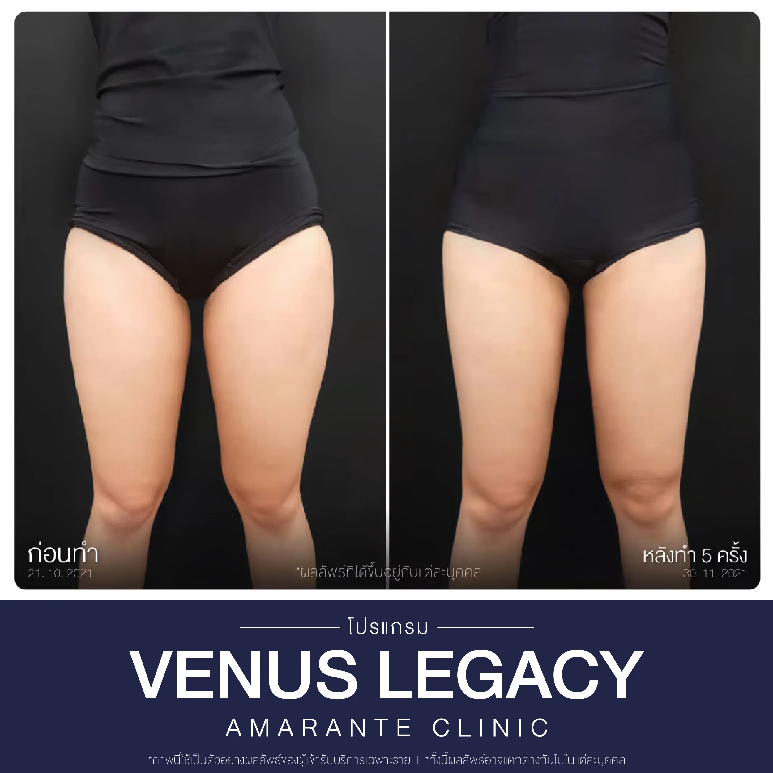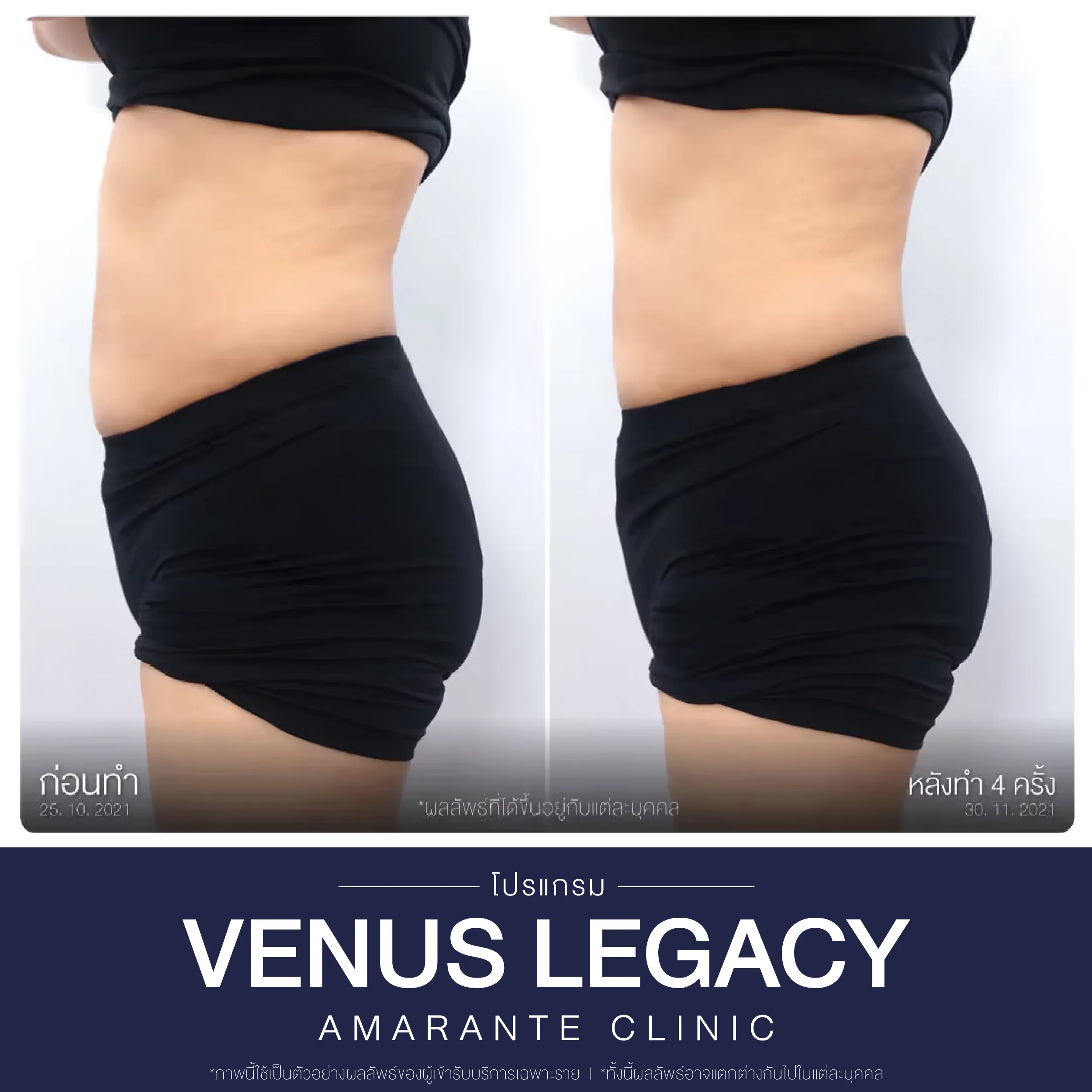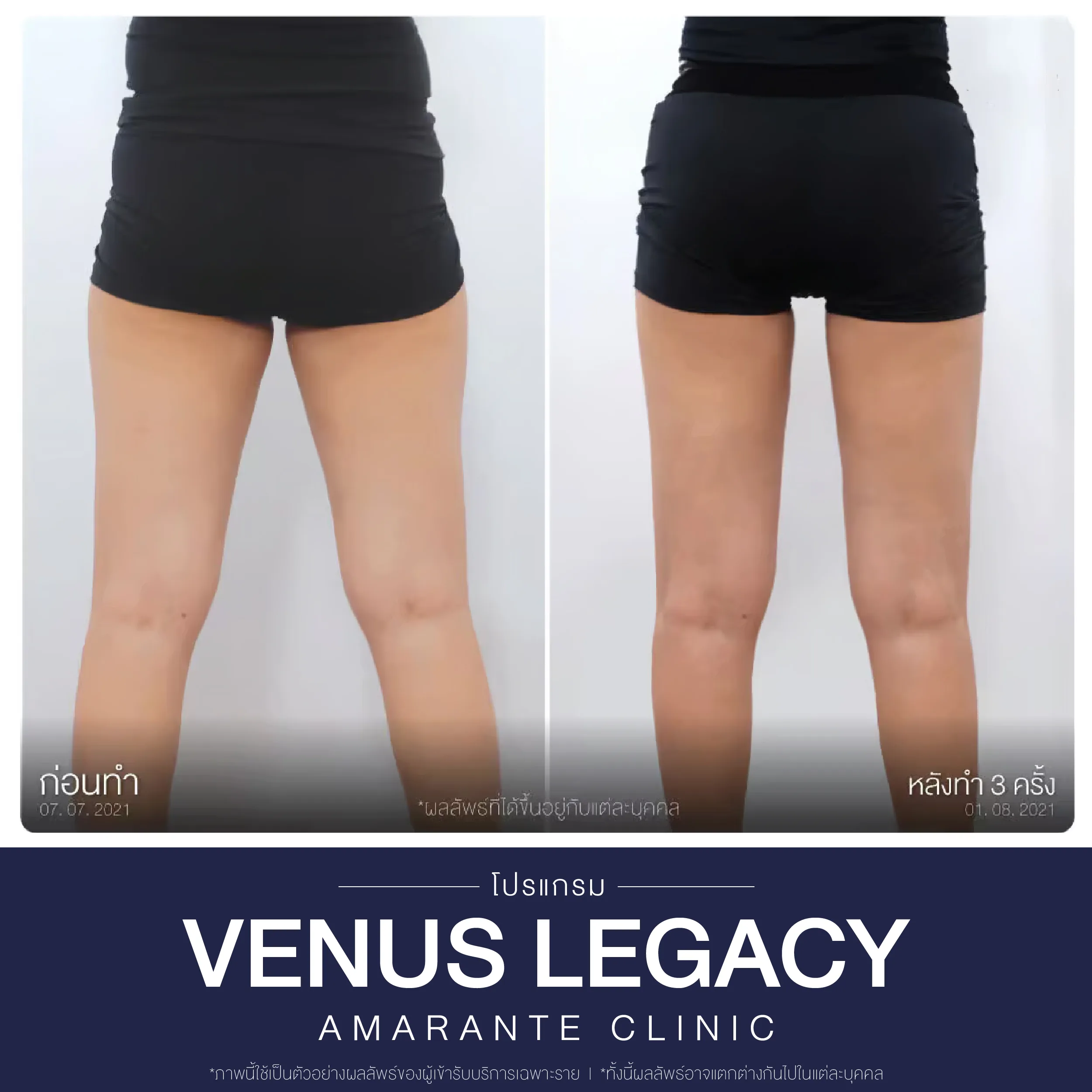 Venus Legacy คือ โปรแกรมนวดสลายไขมัน ดูแลรูปร่างและผิวพรรณ ด้วยเทคโนโลยี 4D™ ที่ผสานพลังงานคลื่น Radio Frequency (RF) เข้ากับการดูดสุญญากาศแบบพิเศษ เพื่อช่วยกระตุ้นการเผาผลาญไขมัน และฟื้นฟูโครงสร้างผิวให้แข็งแรงจากภายใน ลดเลือนเซลลูไลท์ กระชับสัดส่วน และปรับผิวให้เรียบเนียน ผลลัพธ์ที่ได้ไม่เพียงแค่รูปร่างที่กระชับได้สัดส่วนเท่านั้น แต่ยังช่วยให้ ผิวพรรณดูสุขภาพดี เรียบเนียน และเต่งตึงยิ่งขึ้น